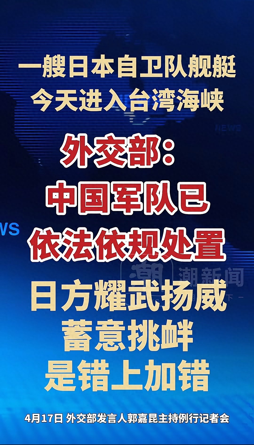 2026年4月17日,北京,外交部例行记者会上,一则消息迅速引爆全网:一艘日本自卫队舰艇进入台湾海峡活动,中国军队已依法依规处置。外交部发言人郭嘉昆当场表态,日方此举是耀武扬威、蓄意挑衅,错上加错,态度之强硬、措辞之严厉,罕见且有力。这事得...