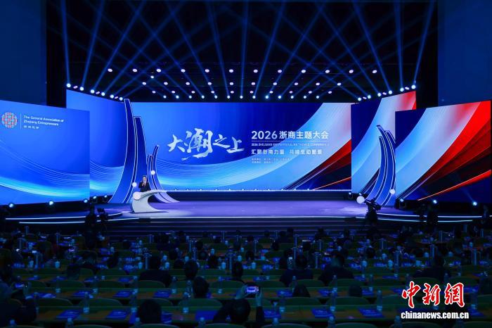 中新网杭州3月19日电(奚金燕)3月18日,由浙江省工商联、浙商总会主办的“大潮之上”2026浙商主题大会在浙江省人民大会堂举行。全球浙商代表及智库专家等800余人齐聚一堂,共谋发展新篇章。