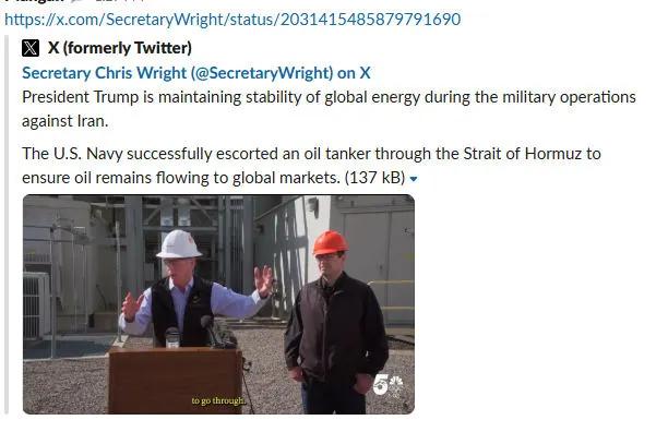一则帖文,让数千万美元的交易化为乌有。 3月10日,美国能源部部长克里斯·赖特在X平台发布了一则帖文,称美国海军护送一艘油轮通过了霍尔木兹海峡。这一消息一度让市场担忧情绪缓解,石油、柴油和汽油期货应声下滑,