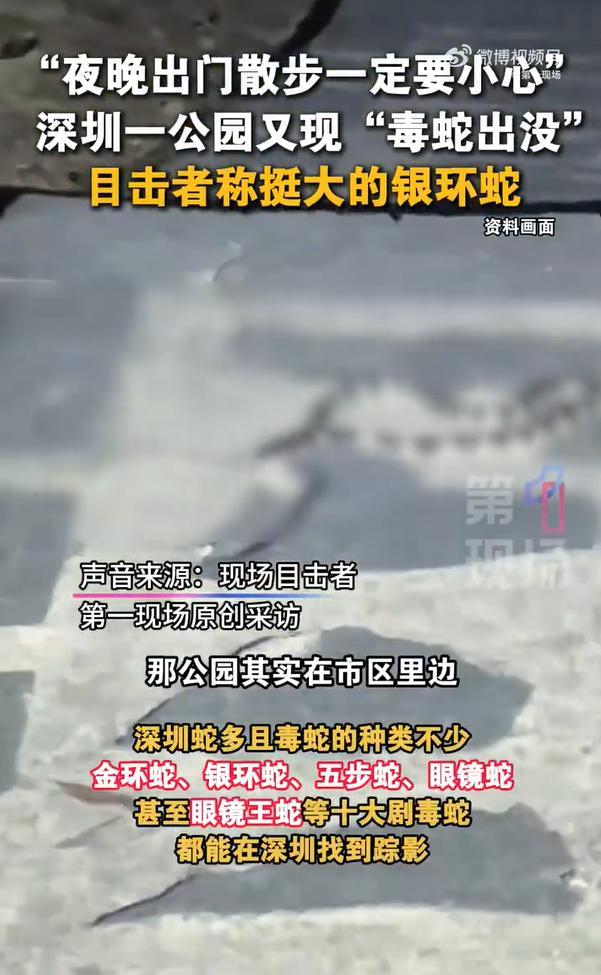 近日,广东深圳有网友发布视频称在翠竹公园散步时疑似遇到剧毒银环蛇。10月12日,目击者在接受采访时提到,该公园位于市区内,周围还有许多居民区。他表示,在这种地方发现这么大的毒蛇确实很危险,提醒大家以后出门散步,特别是晚上,要格外小心