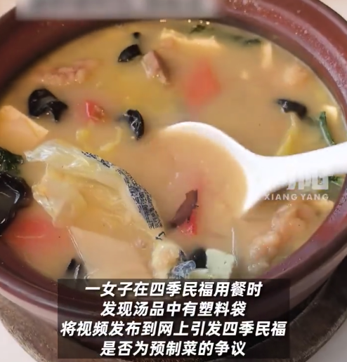 9月17日,北京。一女子在四季民福用餐时发现汤品中有塑料袋,将视频发布到网上引发四季民福是否为预制菜的争议。随后,记者致电四季民福了解情况,得知其汤品中的塑料袋是当天封存蔬菜的塑料袋而非预制菜包装,四季民福员工保证称不是预制菜,如果是预制菜...