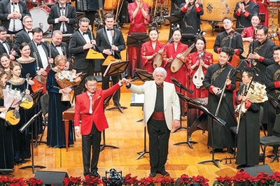 中俄指挥家及乐团同台。 国家大剧院供图 本报电(记者郑娜)近日,中央民族乐团与俄罗斯奥西波夫国立模范民族乐团联袂奉献的特别策划音乐会在国家大剧院上演。这场堪称“国家队”级别的音乐对话,以“万象